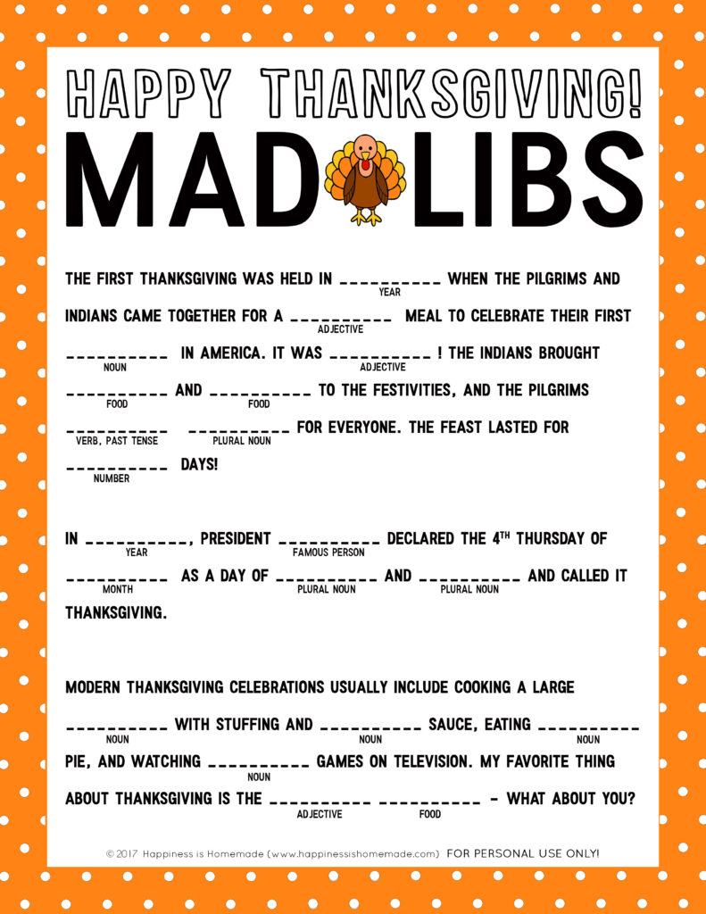Thanksgiving Mad Libs For Kids Free – Generating kinds of mad libs can help your kids create the vocabulary capabilities they require and refresh their information on areas of the conversation approach, in addition to increase comprehending. These video games are pleasurable and might be performed with your loved ones, so that you can practice these online games together. Angry libs are good for students in the uppr basic grades. There are many classes that can make them suitable for upper elementary students. variety of groups that will make them ideal for distinct stages and ages in growth. Discover more strategies to make these online games suited to small children. Thanksgiving Mad Libs For Kids Free.