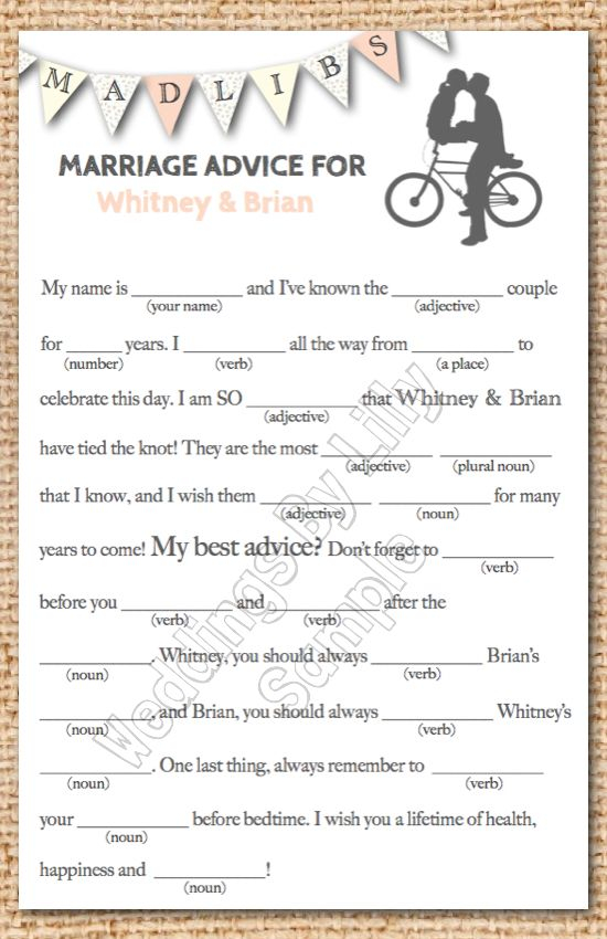 Wedding Mad Libs Marriage Advice – An appealing strategy to individualize a visitor guide would be to publish labels on each and every wedding party mad libs printable. Names of both the groom and bride could possibly be composed in the questions, and after that every single invitee can come up with a unique in the publication after the verdict on the get together. Mad libs for bridal baths are more specific compared to the types employed for marriage ceremonies. They’re a fun difference about the regular guests guide. The bride and groom could then go via their responses and take them home at the next to the get together. Wedding Mad Libs Marriage Advice.